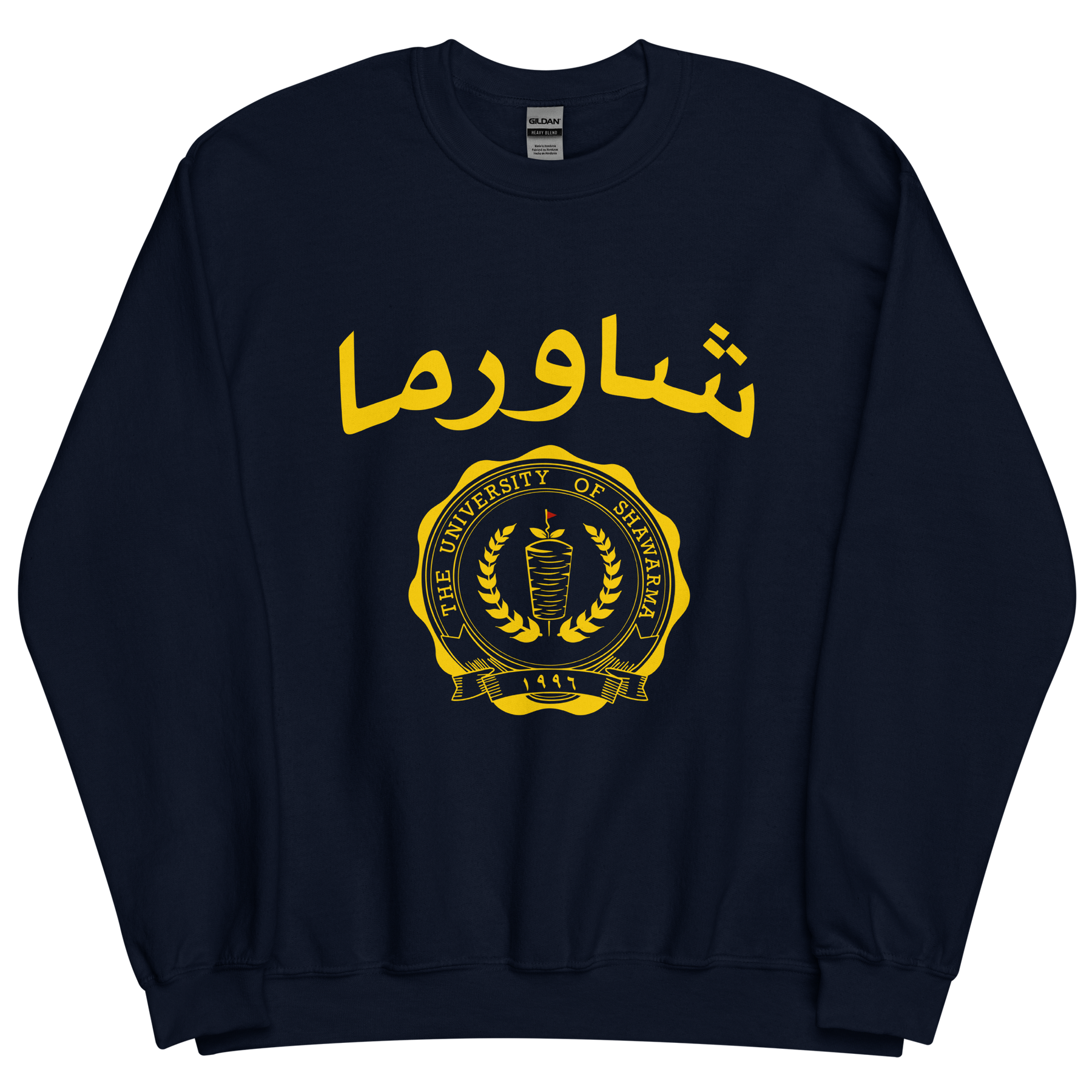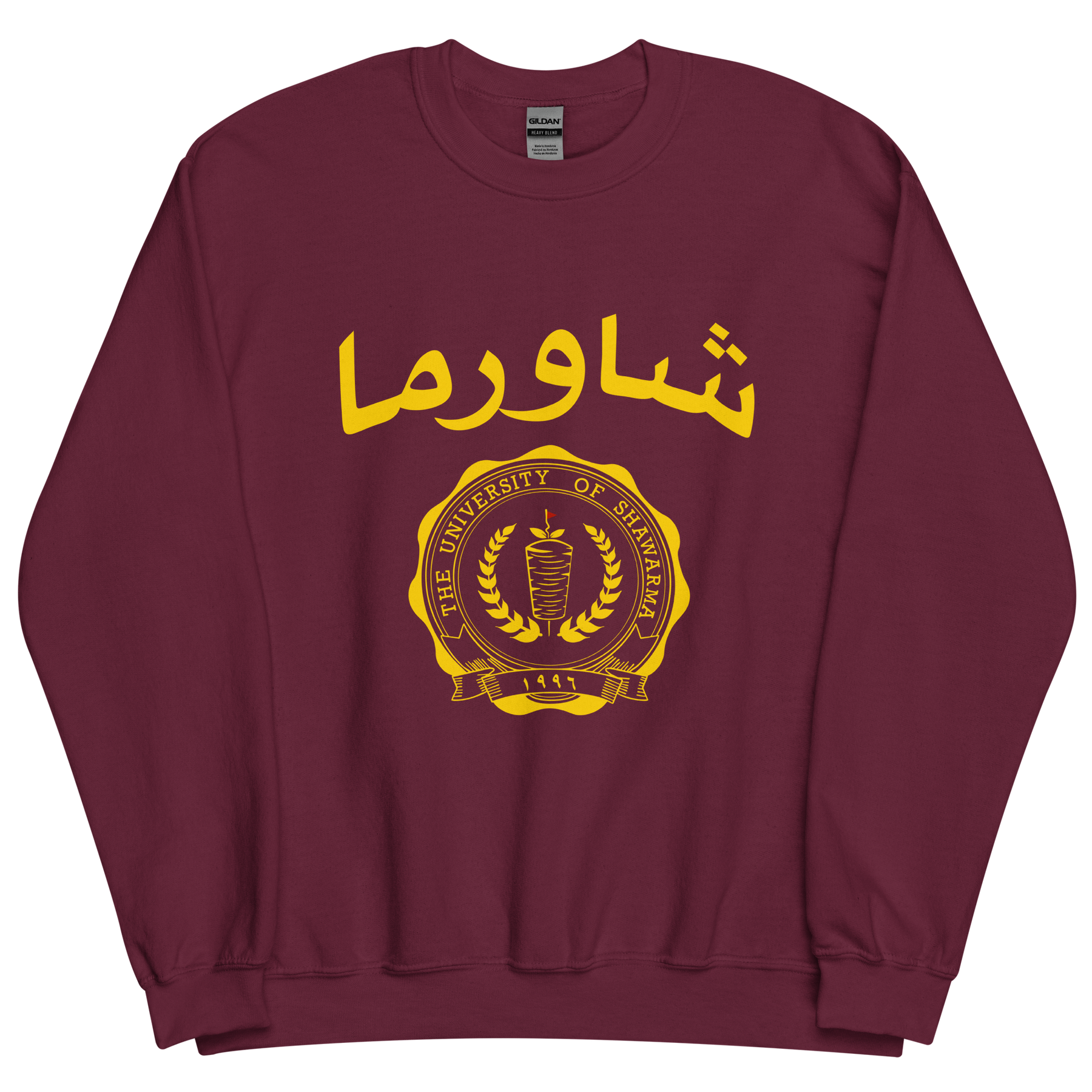 Classic college crewneck with Shawarma University crest on front, gold print available on Navy and Maroon.