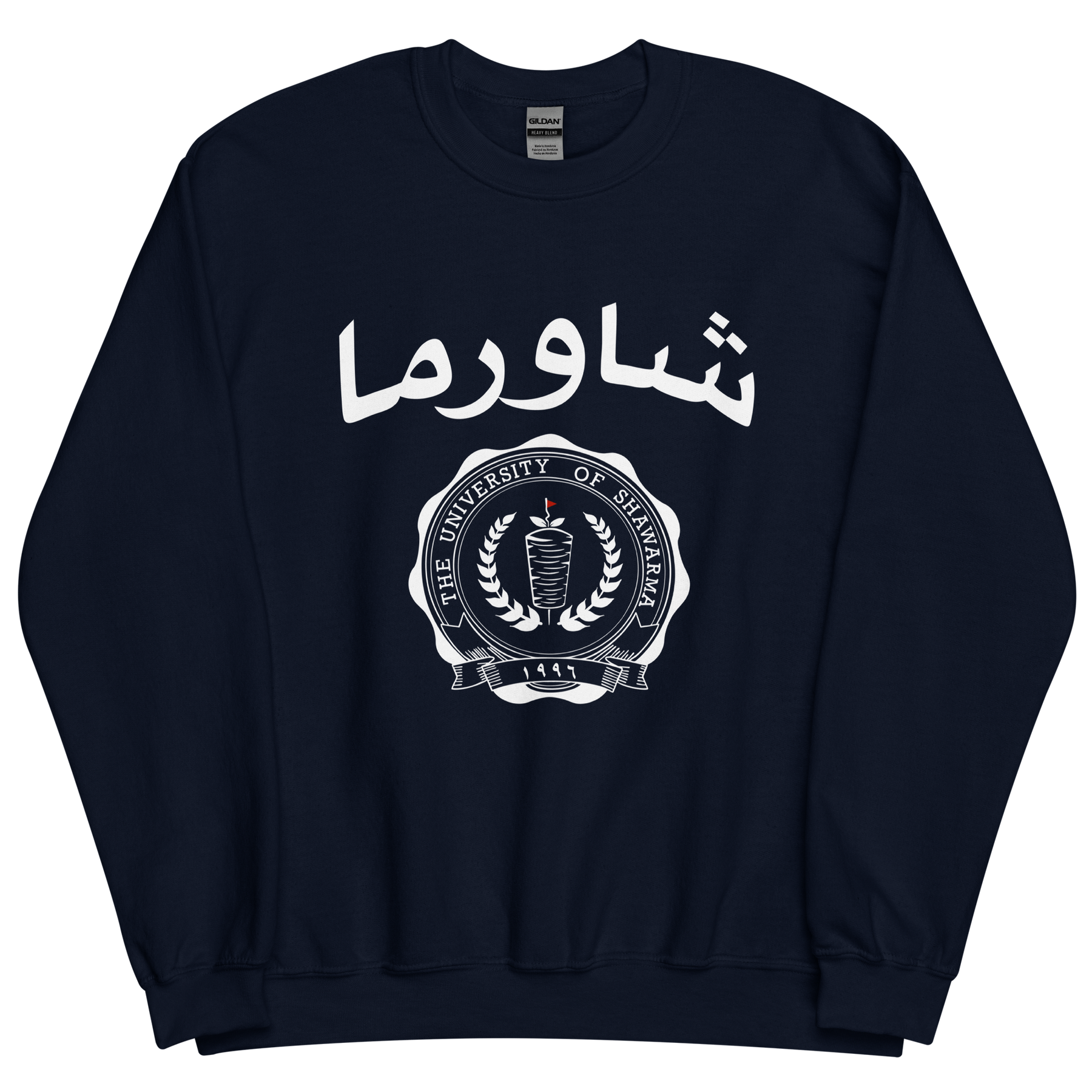 Classic college crewneck with Shawarma University crest on front, white print available on Navy and Forest Green.