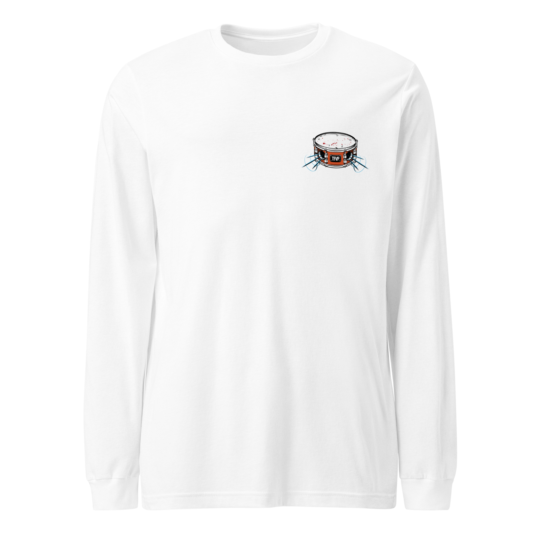 White long sleeve tee featuring drum artwork on front chest and "The Fully Vented" logo on back.
