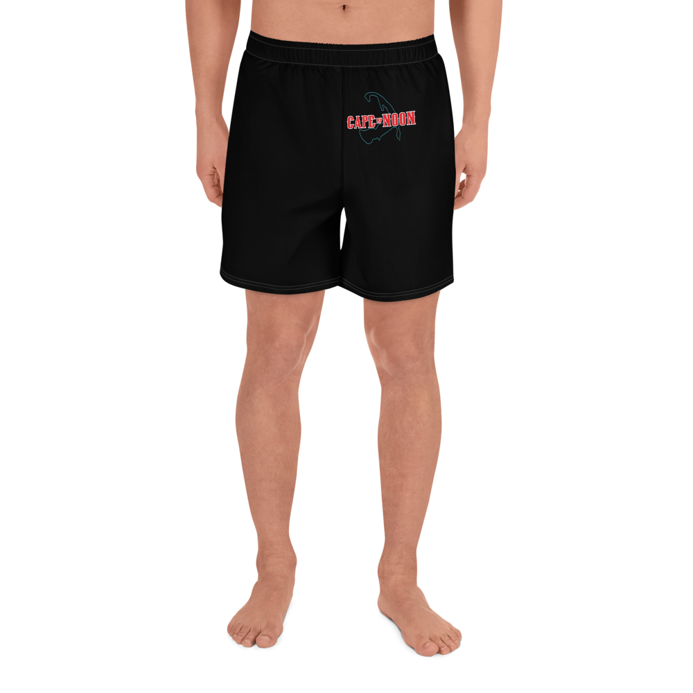 Outline of Cape Cod, with "Cape by Noon" printed above. Red, white, and blue design printed on black shorts. Product Details:
