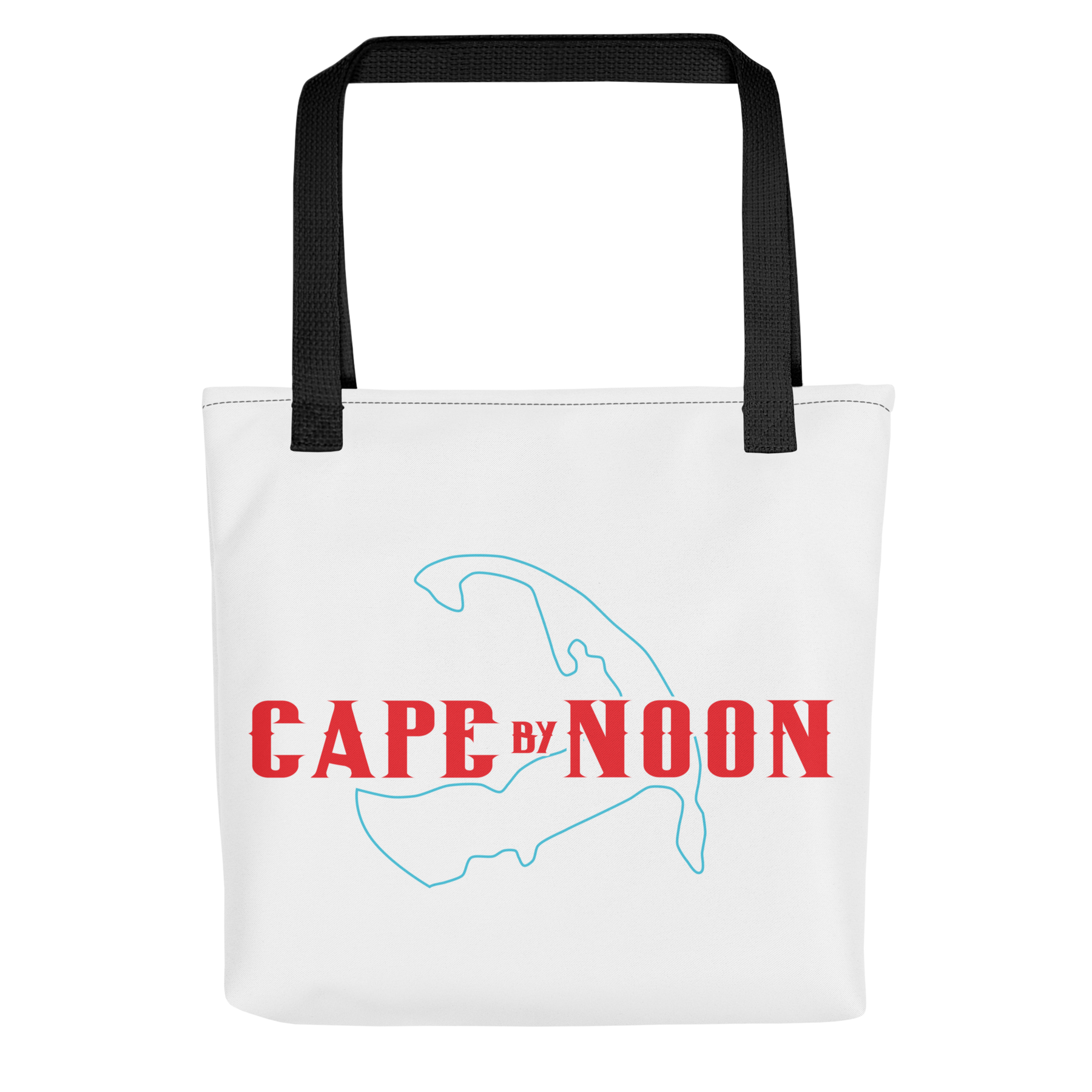 Outline of Cape Cod, with "Cape by Noon" printed above. Red, white, and blue design. Available with yellow, black, and red straps on white polyester bag. Product details: