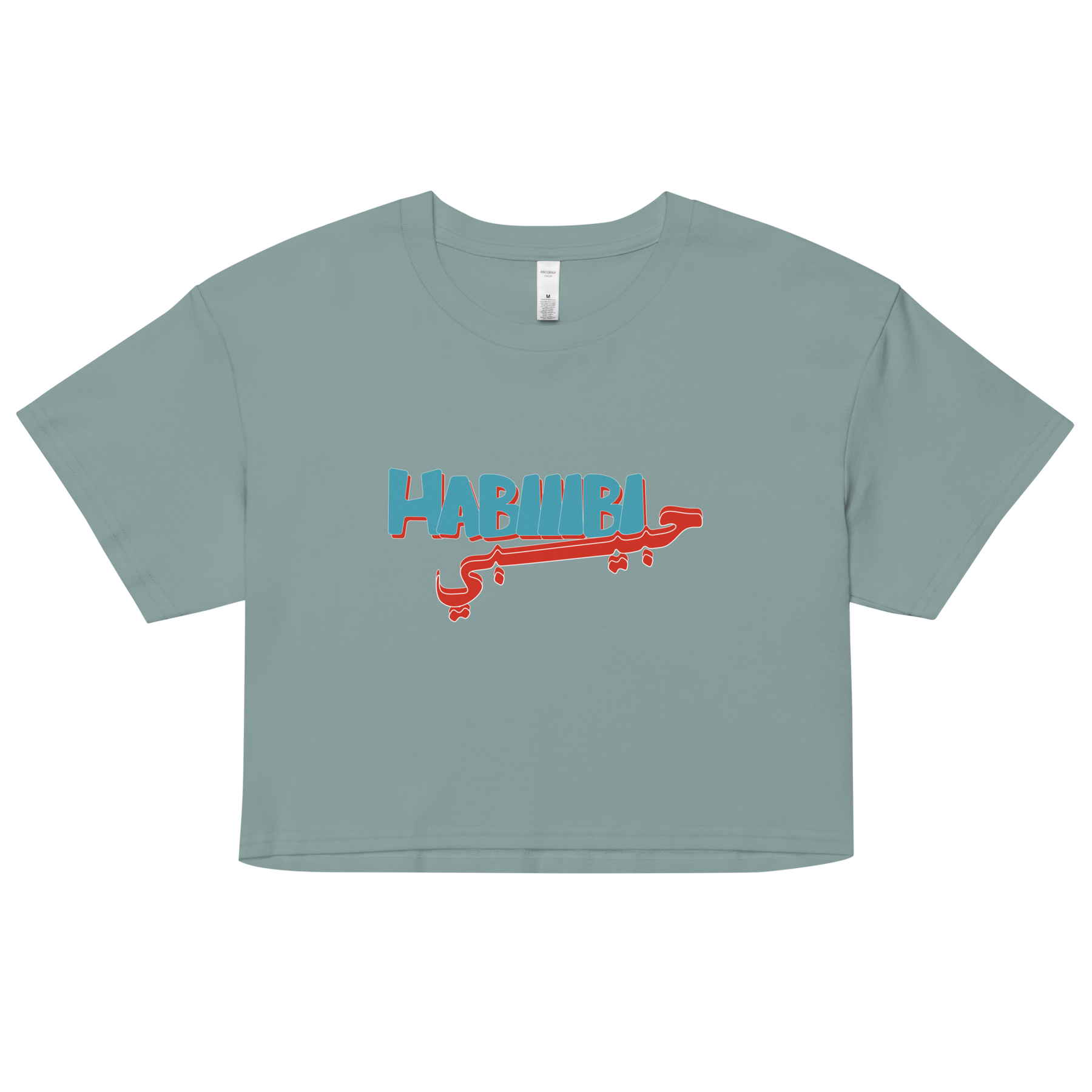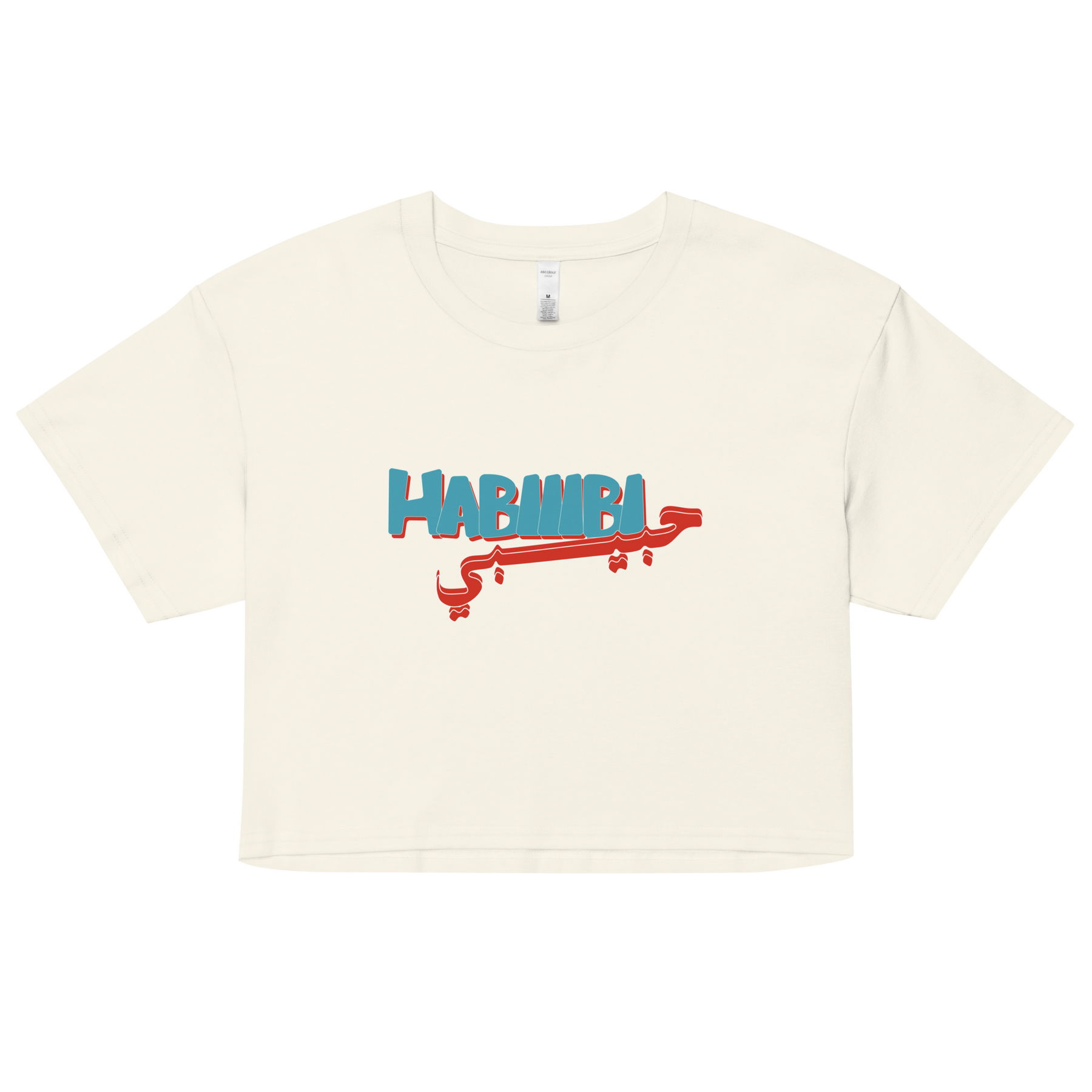 Crop top featuring Nasser's "HABIIIBI" artwork. Available in black, natural, and mineral blue.