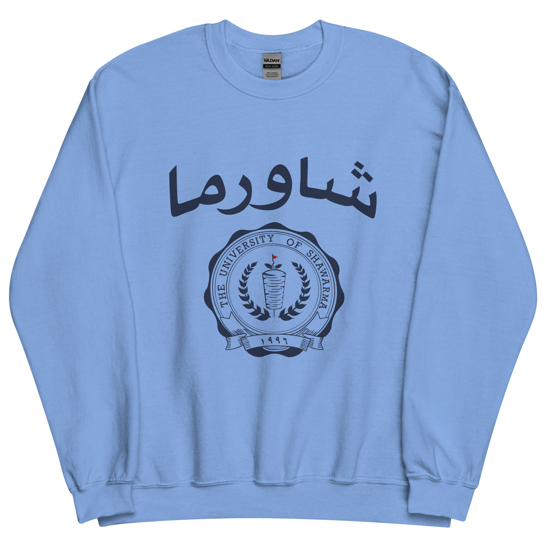 Classic college crewneck with Shawarma University crest on front, blue print available on Carolina blue and Grey.