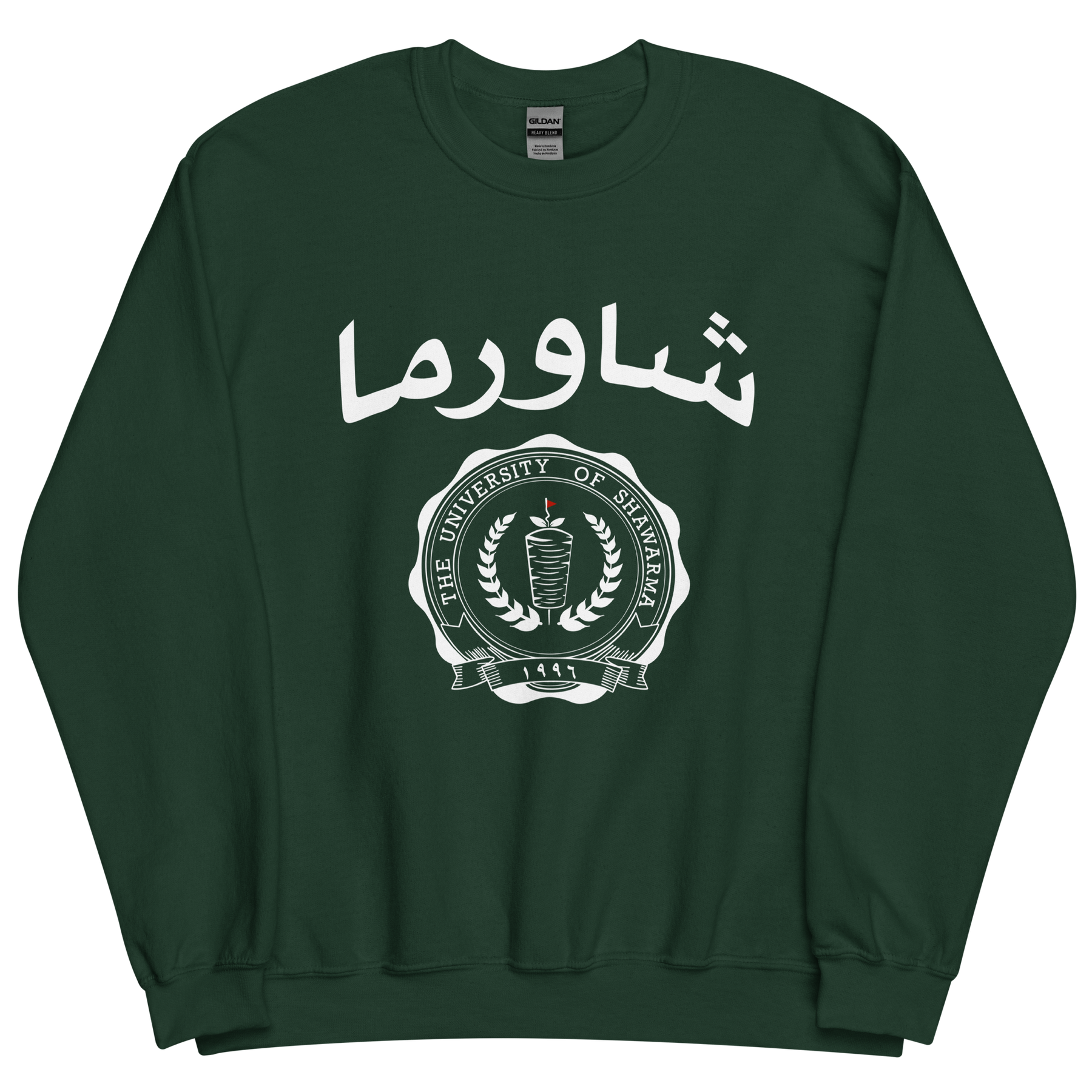 Classic college crewneck with Shawarma University crest on front, white print available on Navy and Forest Green.