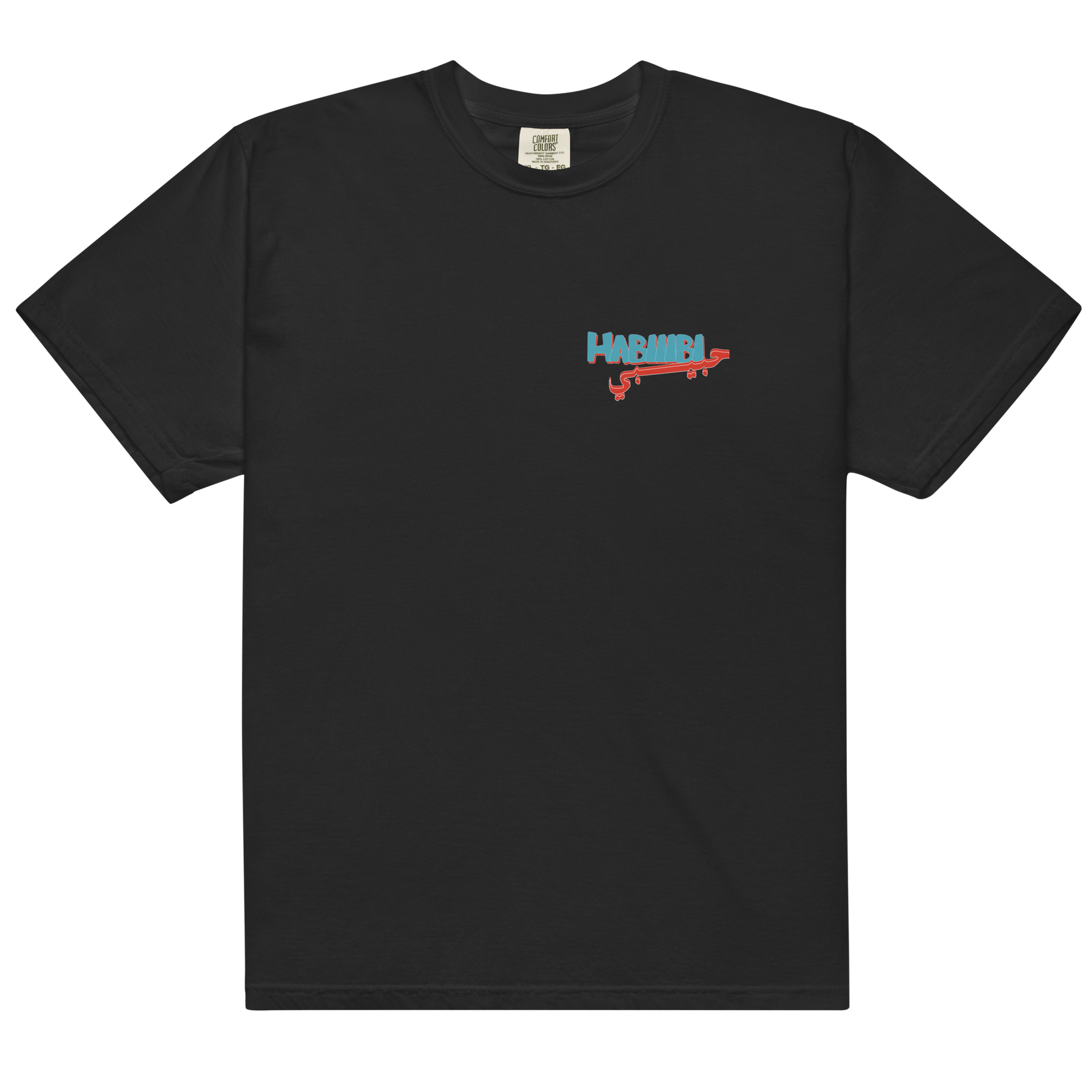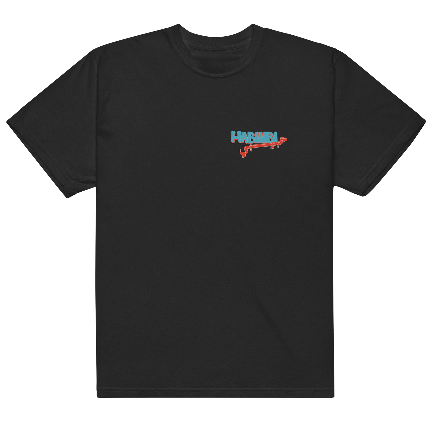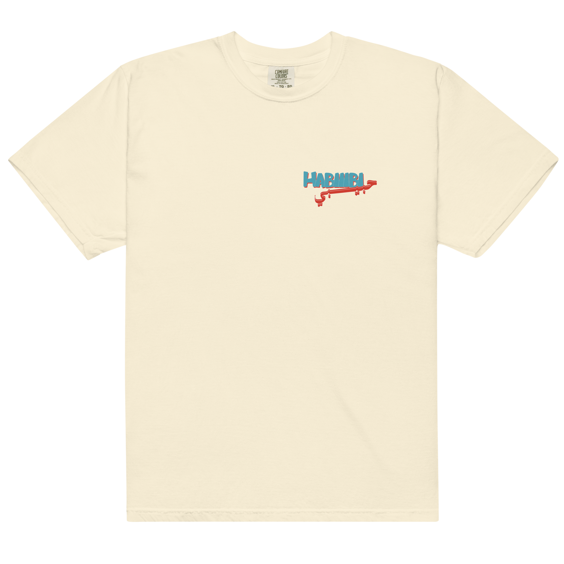 Classic tee featuring Nasser's "HABIIIBI" artwork on front left chest, also featuring stacked "HABIIIBI" artowrk on back. Available in black, ivory, and white.